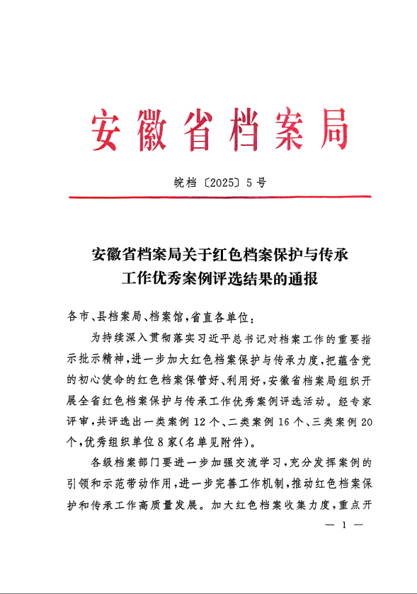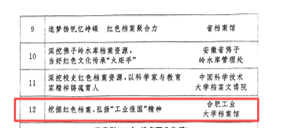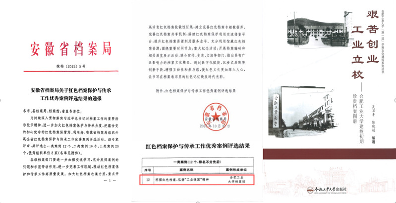 近日,安徽省档案局发布《关于红色档案保护与传承工作优秀案例评选结果的通报》,经专家评审,全省共评选出一类案例12个、二类案例16个和三类案例20个,其中,我校档案馆申报的《挖掘红色档案 弘扬“工业报国”精神》被评选为一类案例,这也是我校档案编研成果首次获评省级一类案例。